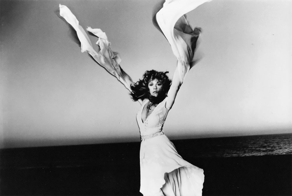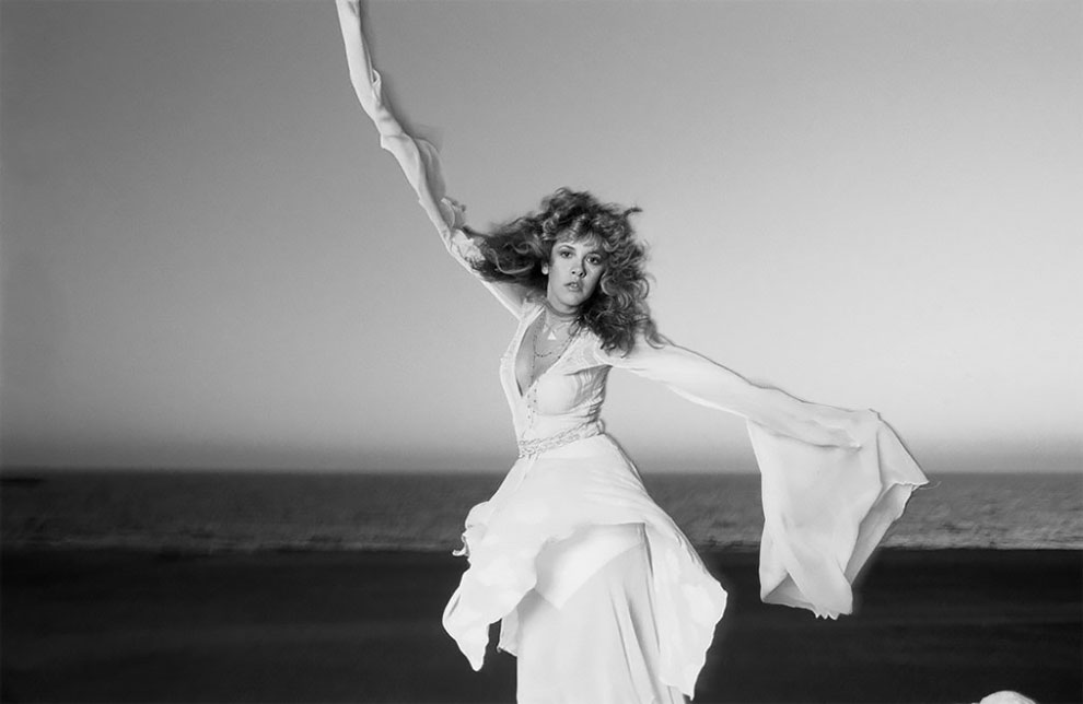 Stevie Nicks from Fleetwood Mac stands in the ocean breeze with her trademark flowy dress sleeves rippling dramatically over her head.